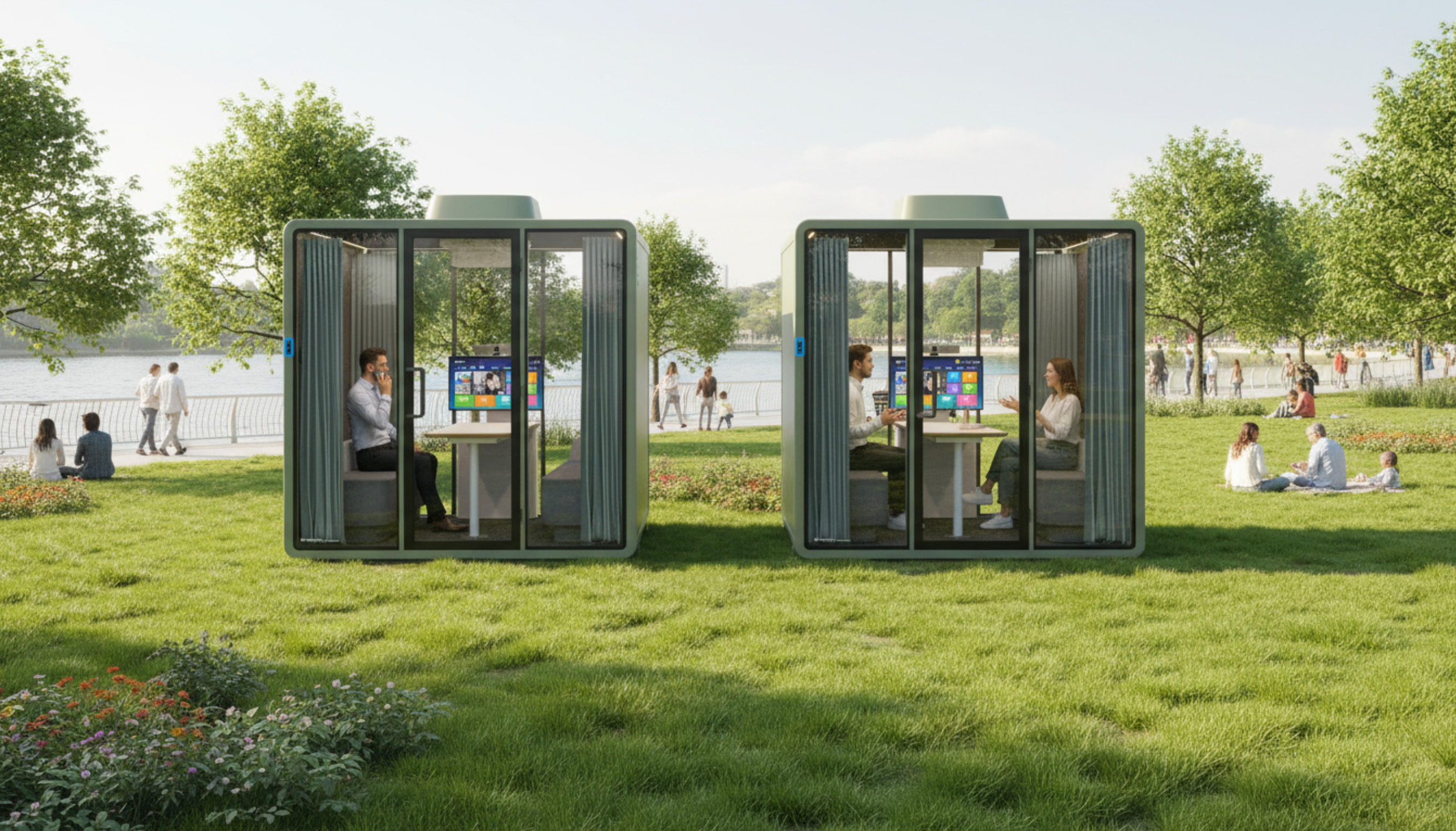 Designed for smart pods and enclosed focus spaces, Komstadt’s smart pod display solutions support private meetings, virtual calls, and focused collaboration. Integrated all-in-one video bar displays deliver high-quality video, clear audio, and touch or wireless interaction, ensuring a consistent conferencing experience even in compact, acoustically controlled environments.